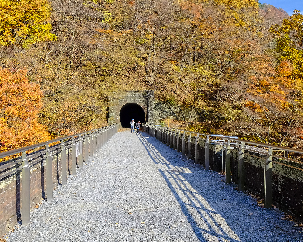 ระหว่างทางจะผ่านแหล่งวัฒนธรรมที่สำคัญของทางรถไฟอุซุยโทเกะ (Usui pass railway) และเดินลอดอุโมงค์ เป็นเส้นทางที่มีจุดน่าสนใจให้ดูมากมาย ผ่านสะพานอิฐอุซุยไดซังเคียวเรียว (Usui Third Bridge) หรือที่เรียกกันว่า “สะพานแว่นตา” ผ่านสถานีมารุยามะ (Maruyama) เก่า เป็นต้น จนถึงสถานีคุมาโนริเก่า (Kyu Kumanori) รวมเป็นเส้นทางเดินป่าที่มีความยาวประมาณ 6 กิโลเมตร จากสถานีรถไฟหมู่บ้านวัฒนธรรมสามารถขึ้นรถไฟระหว่างทางได้